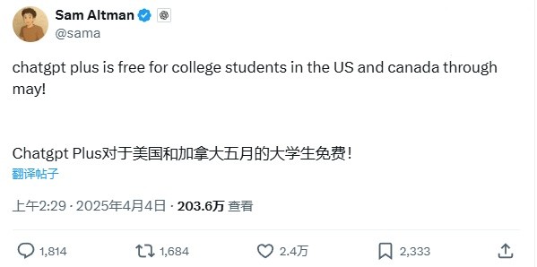 OpenAI CEO Sam Altman wrote on X today that ChatGPT Plus will be free for Canadian and U.S. college students by May.