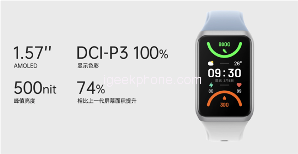 At the press conference tonight, in addition to the new smartwatch, OPPO also released a more lightweight bracelet, the OPPO Band 2.  The new model is equipped with a 1.57-inch AMOLED ultra-clear full screen, and the screen ratio is increased by 74% compared with the previous generation. The square screen can support the display of more content, which is currently the mainstream solution in the industry.