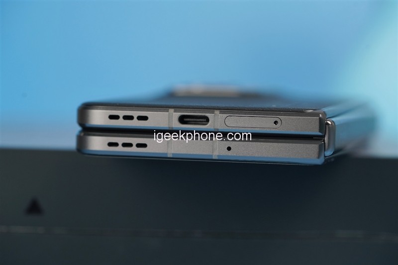 OPPO Find N2 is different from other candy bar phones. Its speakers do not adopt a symmetrical design up and down but a left-right symmetry. When the screen is unfolded, the stereo sound of the left and right channels of watching movies and TV is stronger. The bottom of the phone is also equipped with a Type-C and earphone-shared interface, a SIM card slot, and a microphone. OPPO Find N2 comes with a 67W super flash charging adapter.