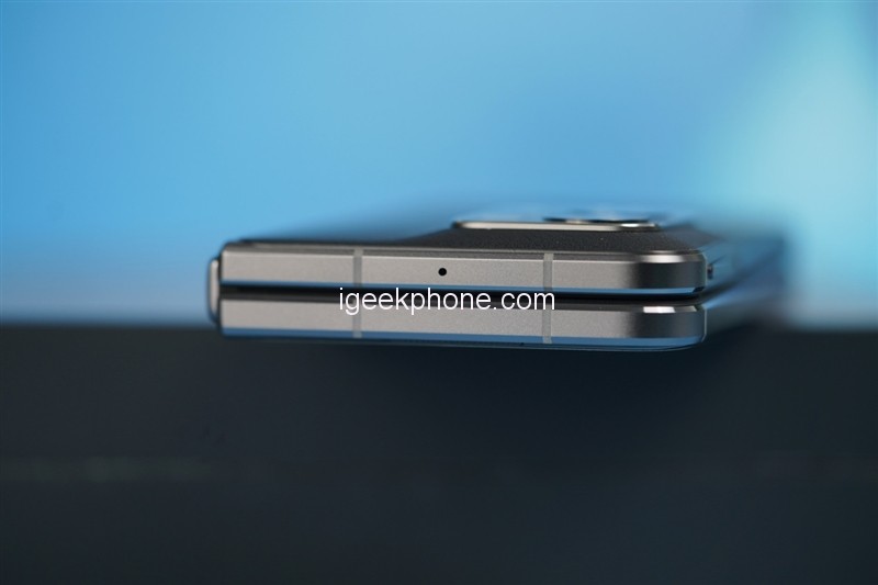 The power adjustment button and volume button of OPPO Find N2 are located on the right side of the fuselage, and the fingerprint recognition function is integrated into the power button. There is a noise-canceling microphone on the top of the fuselage and four antenna strips.
