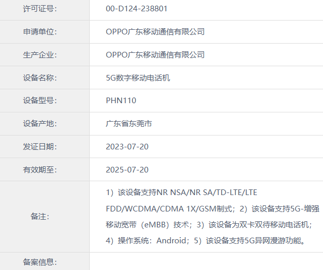 Igeekphone July 31 news, a recent model of PHN110 new machine in the Ministry of Industry and Information Technology completed the network, the document has not been announced, is expected to OPPO Find N3 folding screen mobile phone.