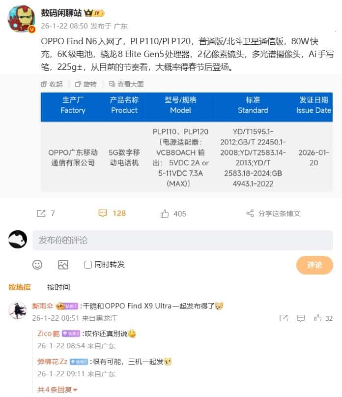 The blogger stated that based on the current pace, the OPPO Find N6 foldable phone is highly likely to be released after the Spring Festival. Comments section also had some netizens speculating that the Find N6 might be released at the same time as the Find X9 Ultra phone.