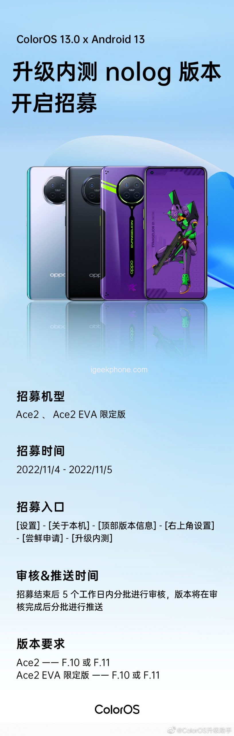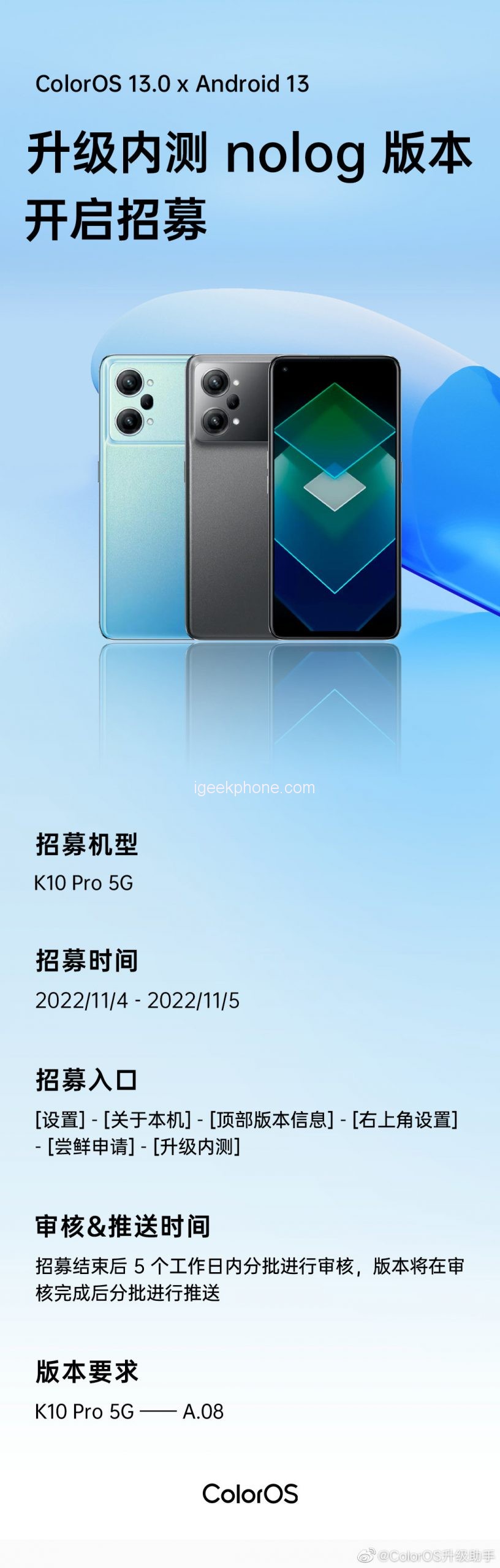 OPPO K10 Pro 5G, Find X2 Pro, Find X2 Pro Lamborghini Edition, Find X2, Find X2 League of Legends S10 Limited Edition, OPPO Ace2, Ace2 EVA Limited Edition have now opened the ColorOS 13.0 upgrade closed beta Nolog version user recruitment.