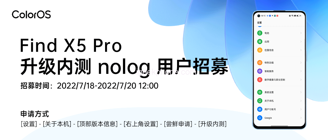 OPPO Find X5 Pro (PFEM10) started the recruitment of Android 13×ColorOS upgrade internal test nolog version. The recruitment time for the nolog version of the internal test is from July 18th to 12:00 on July 20th. The number of recruits is 500. It is expected to be reviewed in batches within 5 working days after the recruitment ends. The version will be reviewed after the review is completed. The release will be done in batches within 3 working days.