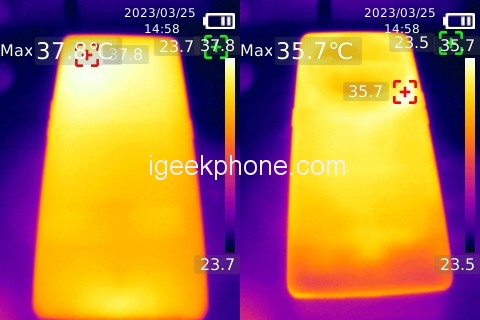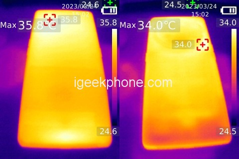 Low power consumption also brings lower temperatures, the front of the phone is 35.8 degrees Celsius, and the back is only 34 degrees Celsius.