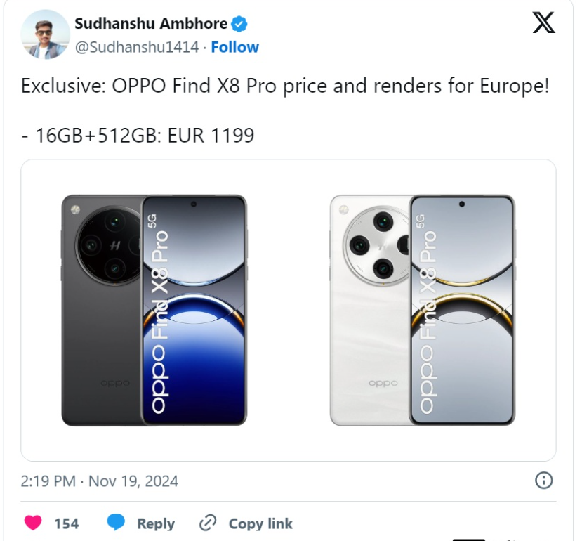 Whistleblower Sudhanshu Ambhore revealed the pricing of the Find X8 Pro in the European market on social media, saying that the Find X8 Pro with 16GB of RAM and 512GB of storage will be priced at 1,199 euros in the European market. Currently about 9,186 RMB).