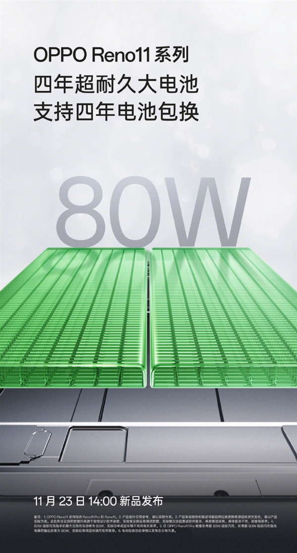 OPPO official announced today that the first batch of users to buy OPPO Reno11 series can enjoy a four-year battery pack replacement plan, support longevity version 80W super flash charge, and support extreme cold charging of minus 20 degrees, more reliable and secure.