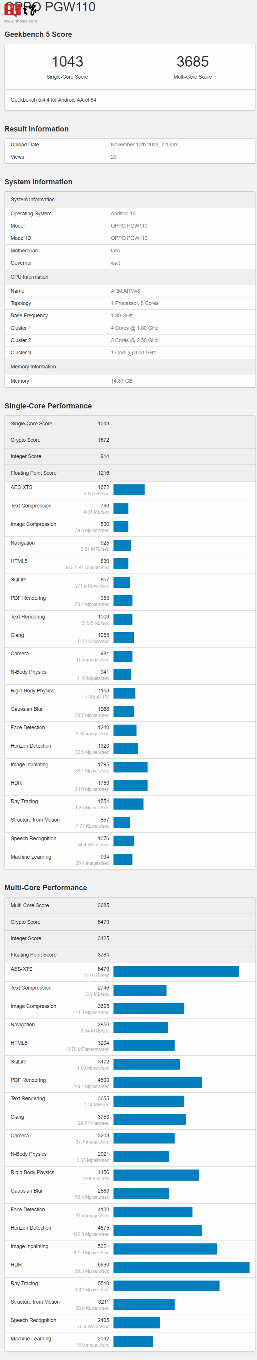 It will have a single core score of 1,043 and a multi-core score of 3,685, and will come with 16GB of RAM and run Android 13, which should be a Reno 9 Pro or Reno 9 Pro + based on these flagship specs. But previously @Digital Chatterbox claimed that Reno 9 Pro + is a Snapdragon 8+ Gen1 made by TSMC.