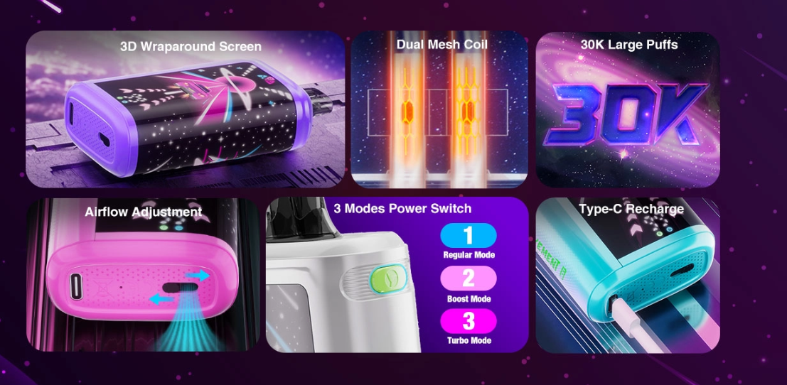 Movement NEXT 30K: What sets the NEXT apart is its three operational modes. Choosing between Regular, Boost, and Turbo is as simple as pressing the fire button three times in succession. In Regular, the device doles out milder, prolonged hits (max 30K puffs); in Boost, you get denser clouds but around 22K puffs; and in Turbo, it cranks up power for punchy, flavorful hits at around 15K puffs. The adjustable airflow slider lets you tailor each inhale from a restrictive, cigarette-like draw to an open-lung experience. Lastly, the Mega HD screen shows a numeric representation of remaining battery percentage alongside a little e-liquid bar indicator—no guessing games.