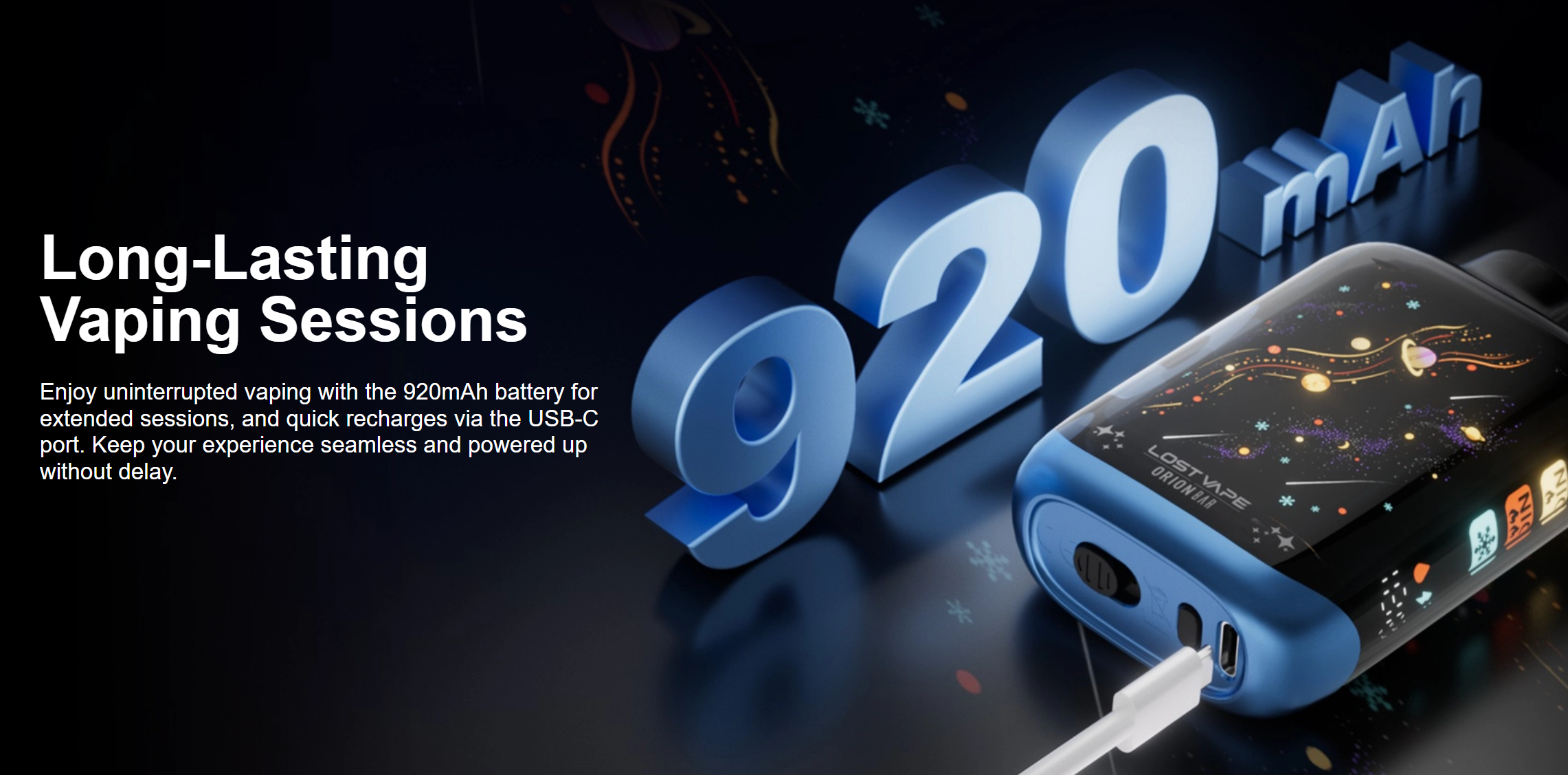Orion Bar 50K: Sporting a slightly larger 920 mAh battery, the Orion Bar similarly uses USB-C. Even with a marginally larger tank, the extra juice paired with the bigger e-liquid reserve often means you recharge only once every week or two (depending on usage). Charging time sits around 50–60 minutes to reach 100%. The LED halo light around the base indicates charging status: red when charging, blue when full.