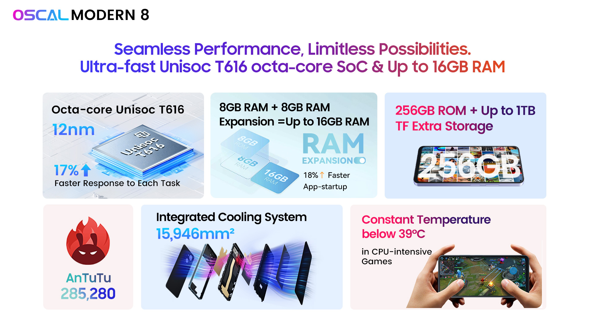 Gratifying the young customers for the modern needs of silky-smooth performance, the OSCAL MODERN 8 is built with an Unisoc T616 octa-core processor at its core, complemented with up to 16GB of RAM (8GB +8GB extended). It scores 285K+ on the Antutu benchmark. It offers two variants of internal storage: 128GB and 256GB, both of which can be expanded further by 1TB with a microSD card for users with the need for more files and apps.