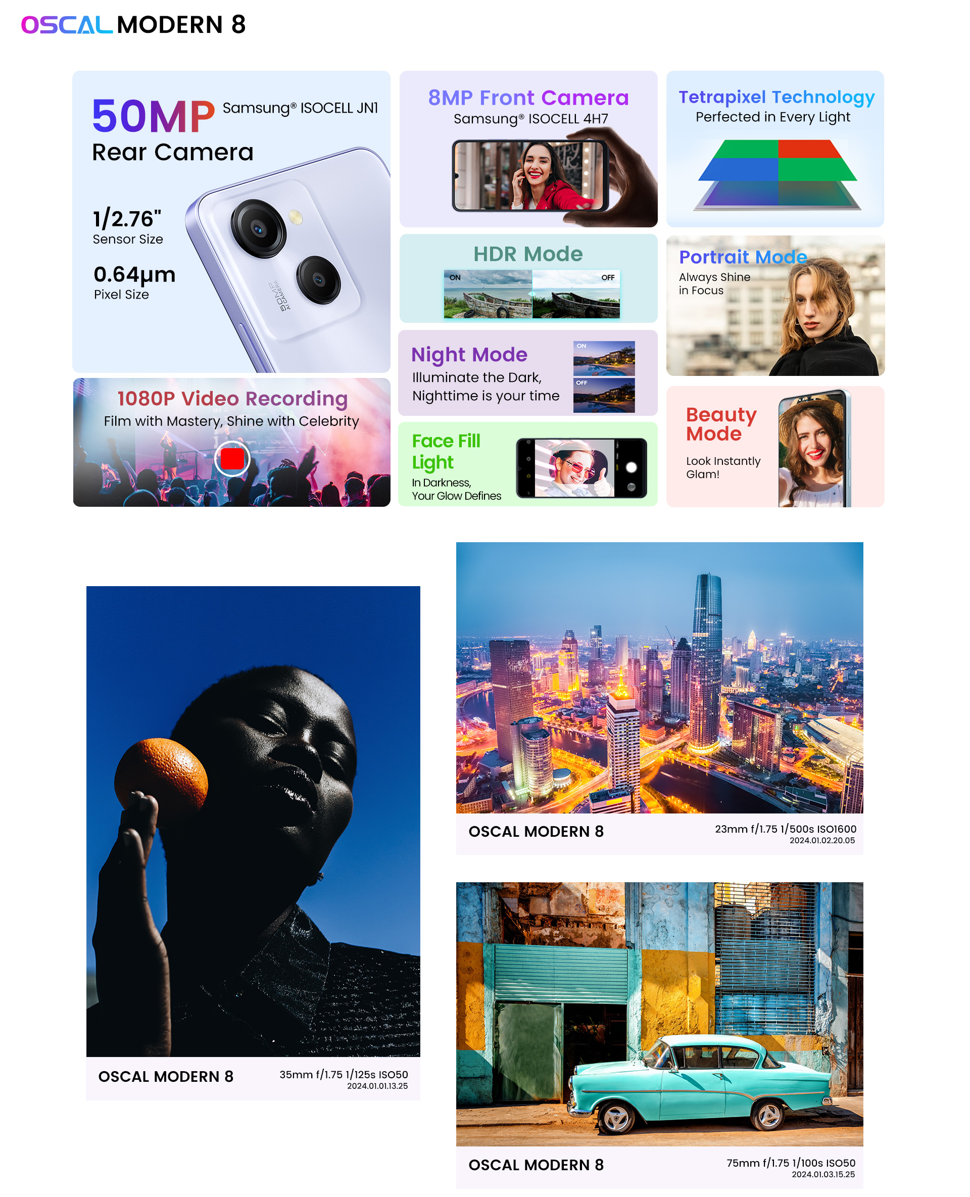 Tailored to allow users to capture more wonderful moments, the OSCAL MODERN 8 is equipped with a 50MP Samsung JN1 sensor, which is rare in the segment. Featuring a 1/2.76-inch sensor size, it boasts higher light sensitivity to allow users to freeze every memorable moment with high quality pictures, day or night. Express your feelings through pictures with OSCAL MODERN 8 and make waves in your social media.