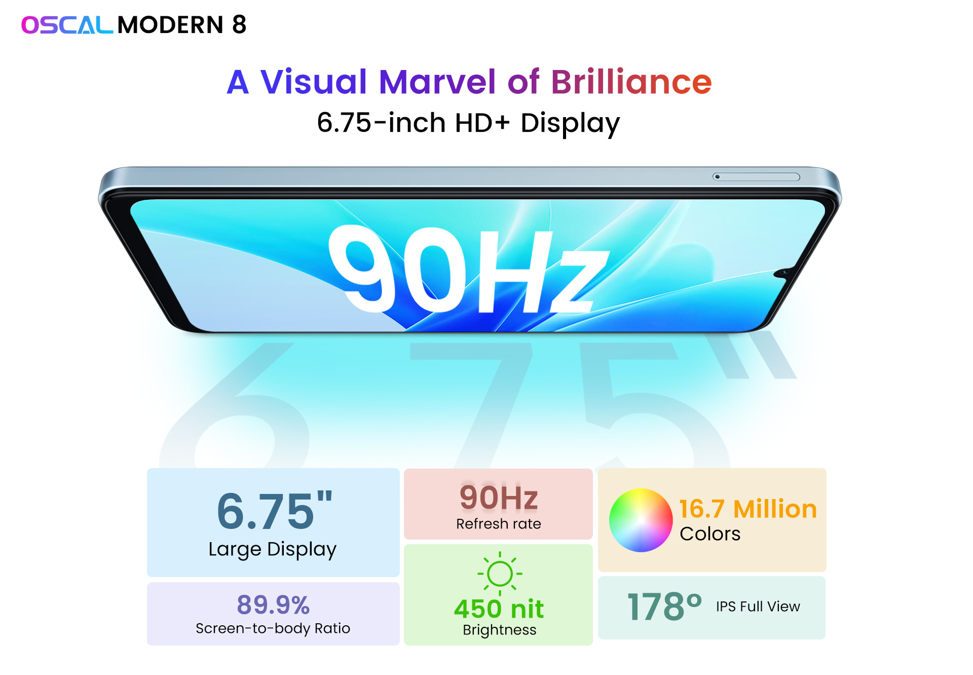 Display-wise, the OSCAL MODERN 8 has a 6.75-inch center-aligned punch-hole display pushing the screen-to-body ratio to 89.9%, further ensuring users’ immersive viewing. It has a 90Hz refresh rate, enabling fluidity in users’ viewing, as well as every touch, scrolling and swiping in their website browsing and gaming. Mesmerize in the vibrant digital world and enjoy your visual feasts.