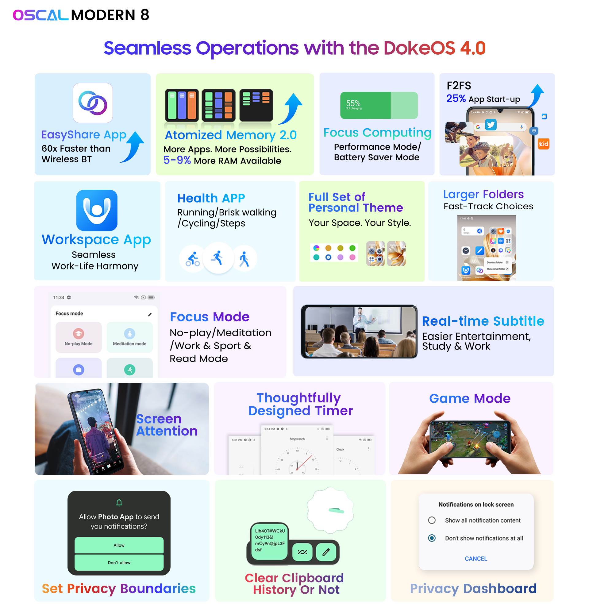 Providing seamless navigation and effortless everyday routines from gaming to working, the OSCAL MODERN 8 is bundled with the latest Android 13-based DokeOS 4.0 operating system with fluency enhancement, user-friendly interaction, useful functions and self-developed apps. With the Workspace app, users can manage an app separately in two individual zones with two individual apps. There are even more to be expected.