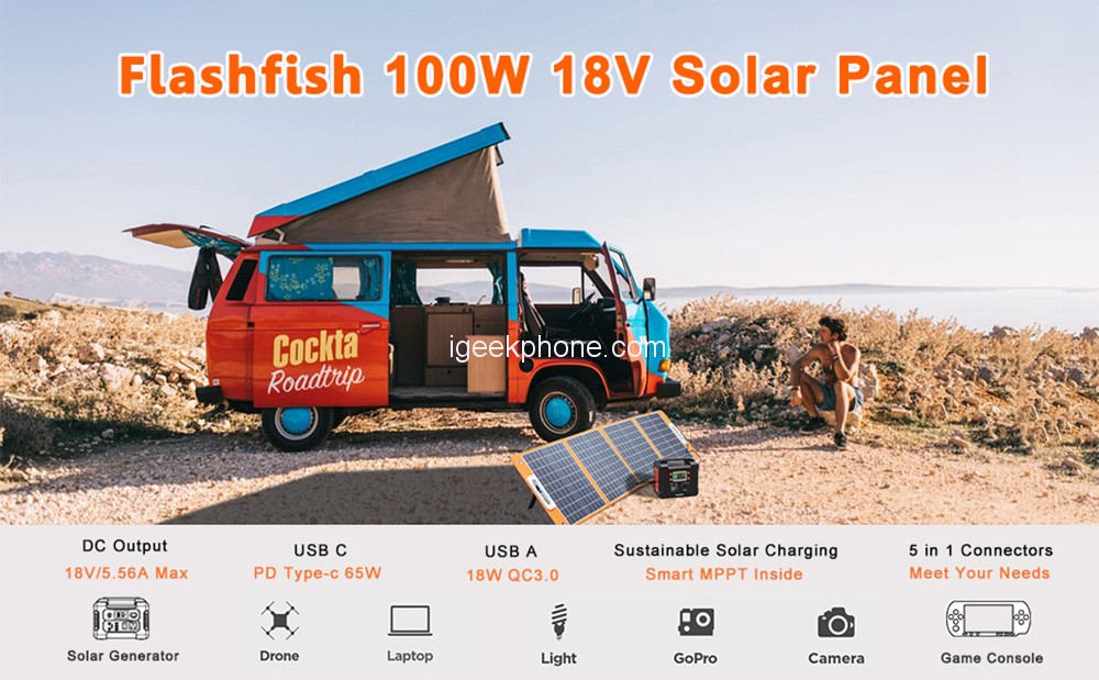 The Flashfish 100W foldable solar panel is a versatile and efficient charging solution designed for use with a variety of solar generators. It comes with a DC5521 cable for charging the Flashfish 300Wh (sold separately); as well as four extra connectors to accommodate Goal Zero/Jackery (8mm DC Adapter); Suaoki Portable Generator (5.5 * 2.5mm DC Adapter), and other devices with 3.51.35mm and 6.33.0mm connectors. The panel also features an intelligent charger with an advanced chip that delivers a 30% faster charging efficiency than traditional controllers. It can intelligently identify your device and adjust the charging speed accordingly, while protecting it from overcharging and overloading. The charging current is monitored and automatically adjusted based on the sunlight level for optimal performance.
