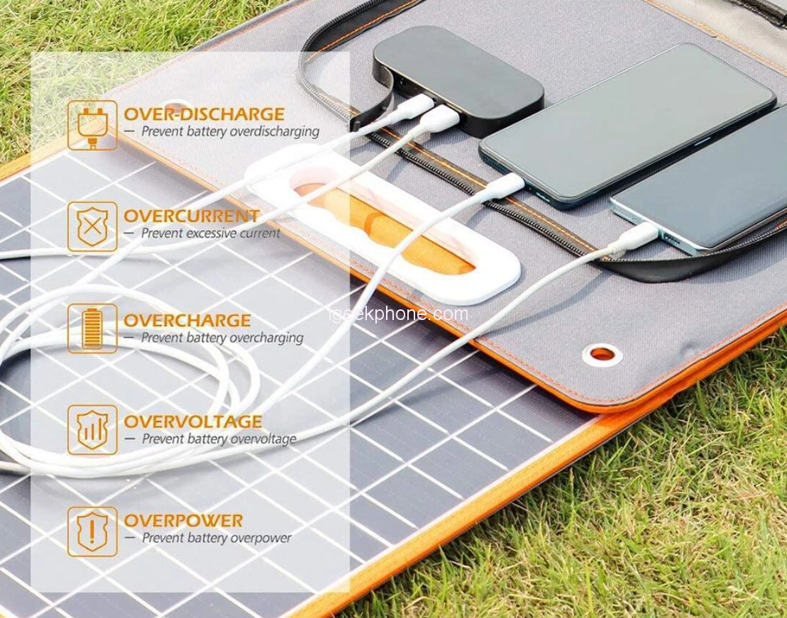The portable solar panel that weighs only 6.17lb and can be easily transported, hung and removed with its folding dimensions of 16.34×15.83in. The panel is made of high-efficiency solar arrays that can convert up to 21.5-23.5% of solar power into free energy. It also comes with 1* USB-C(65W) and 1* USB-A(18W) output port, with the USB-C port supporting PD charging. This solar panel is perfect for charging multiple small devices simultaneously, such as smartphones, tablets, GPS devices, digital cameras, and more. It is an excellent choice for outdoor activities and even during unexpected power outages.