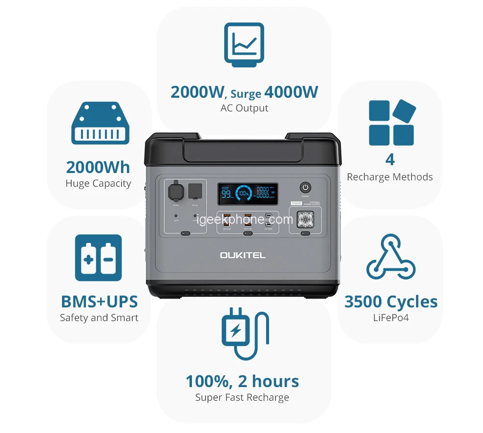 The OUKITEL P2001 is a powerful portable power station that can use o power various household appliances and heavy-duty tools. With its 2000W (surge 4000W) AC pure sine wave inverter generator, it is capable of powering devices such as microwaves, air conditioners, hair dryers, electric drills, and bench grinders. Its LiFePo4 battery can provide 3500+ life cycles, making it a reliable source of power for extended periods.