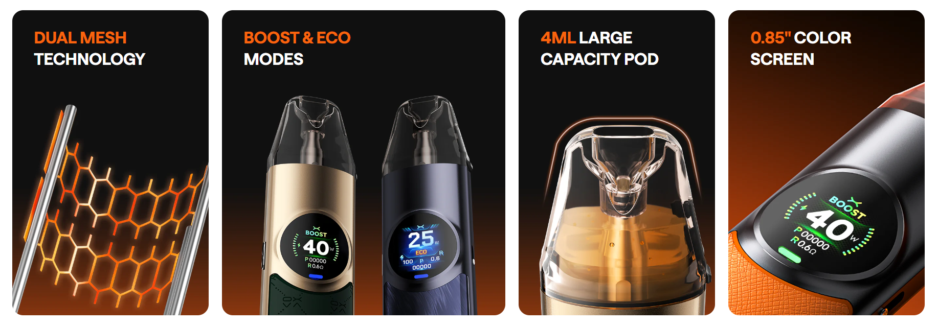 At the heart of the NeXLIM Start is Dual Mesh Technology. Flip between BOOST mode (for a 200% flavor surge via dual‑coil firing) and ECO mode (for a 200% longer coil lifespan using alternating mesh). With 4 mL capacity, a 1500 mAh battery, and up to 40 W output, it gives you six coil options (0.6/0.8/1.2 Ω) and plenty of battery to get through the day. The dynamic screen themes—Classic, Robot, Cyberpunk—add a playful touch, cycling through animations as you vape.