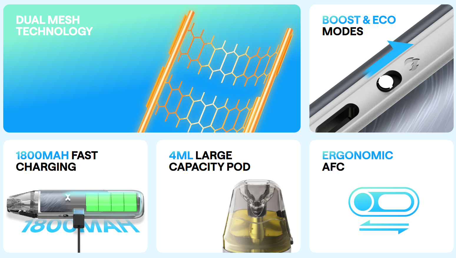 Battery & Pod Capacity: A robust 1,800 mAh battery supports fast 5 V/2 A charging (just 45 min to full) and can last up to 10 days in Eco Mode. The 4 mL pod means fewer refills.