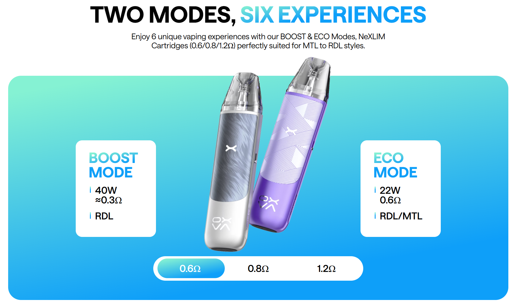 Modes & Output: Toggle between Boost Mode (40 W, rich RDL experience) and Eco Mode (22 W, optimized for longevity). Six unique vape profiles await, tailored by pairing mode with 0.6, 0.8, or 1.2 Ω NeXLIM pods.