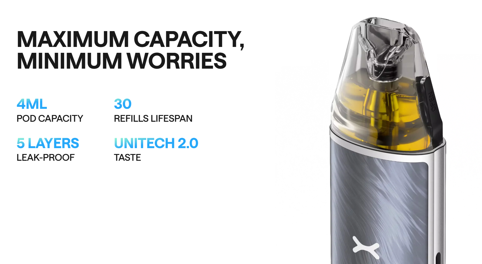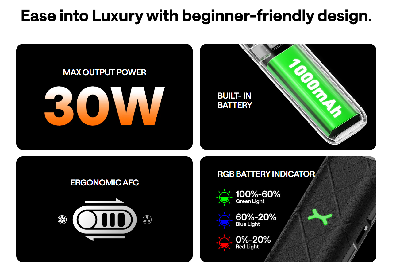 Power & Battery: Up to 30 W max output from a built-in 1,000 mAh cell—enough to keep most casual vapers satisfied for a day or two (OXVA lab data suggests around 2 days on a 0.8 Ω pod).