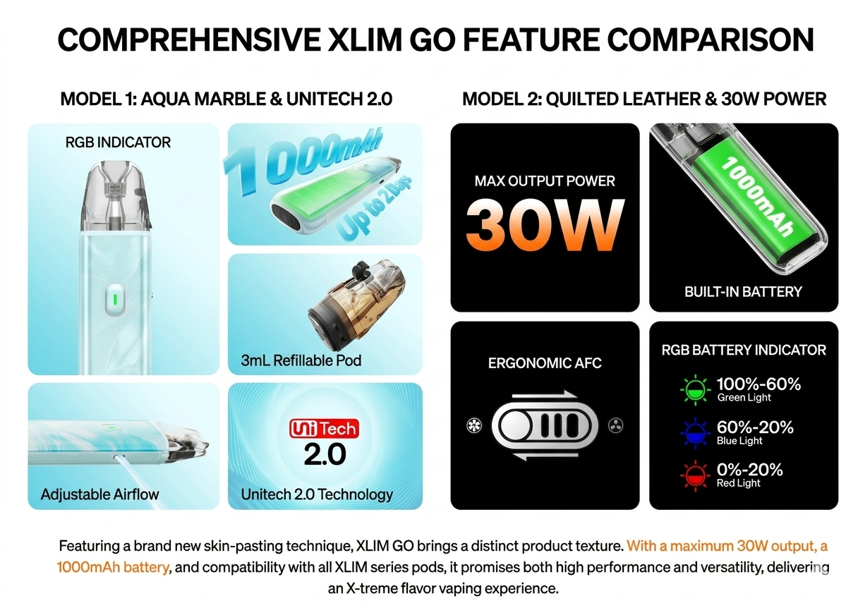 Another key difference is the overall user experience. The XLIM GO keeps things minimal with a clean tri-color battery indicator and a more traditional approach. Meanwhile, the GO LITE adds small but thoughtful touches, like an RGB battery indicator and even an anxiety-relief dot for tactile interaction, subtle features that make daily use feel more engaging. It also emphasizes cost savings, promoting refillability as a smarter alternative to disposable vapes.