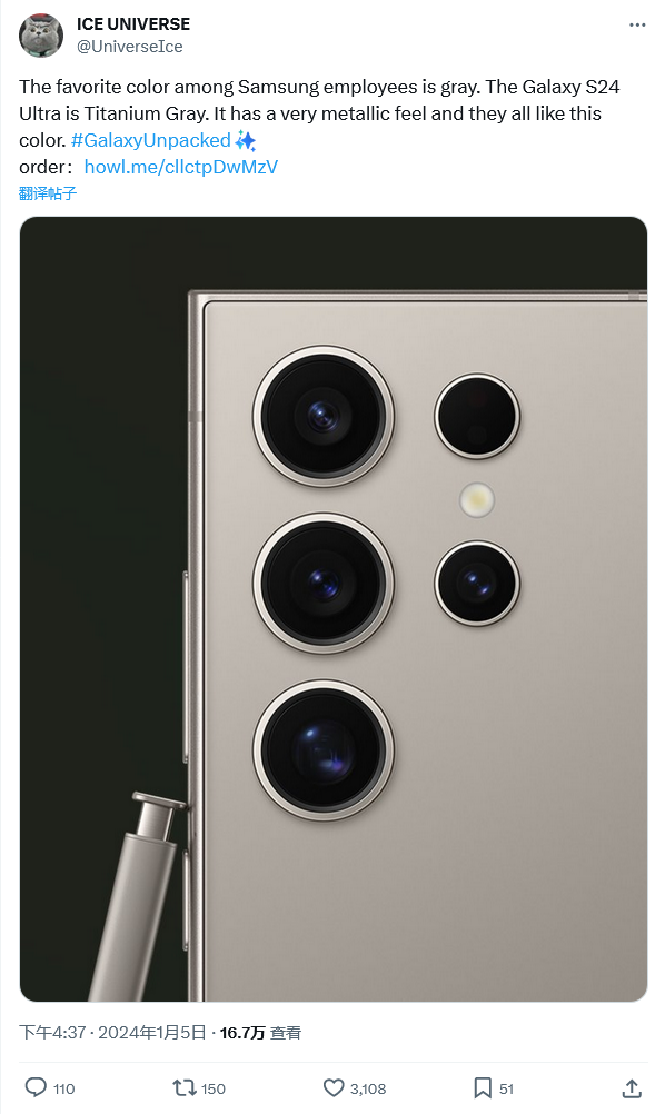 Igeekphone previously reported that the Samsung Galaxy S24 Ultra uses 200MP main camera (SOCELL HP2SX), supports 4K120fps video recording (may be castrated), and supports the display of HDR photos; 6.8-inch Dynamic AMOLED 2X display with QHD+ (1440p) resolution and 2600 nits brightness; The built-in 5000mAh battery can charge from 0% to 65% in 30 minutes.
