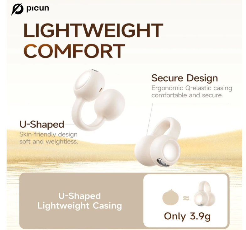 The PICUN W5 breaks away from traditional earbud designs with its earclip structure, engineered to stay firmly in place during vigorous activities. The lightweight, flexible silicone earhooks ensure a snug, customizable fit, reducing the risk of slippage during runs, workouts, or sudden movements. Weighing in at just 5.5 grams per earbud, they prioritize comfort without sacrificing durability. The matte-finish charging case adds portability, while the earbuds’ ergonomic shape caters to long listening sessions. Available in sleek black or white, the W5 exudes a sporty yet minimalist aesthetic.