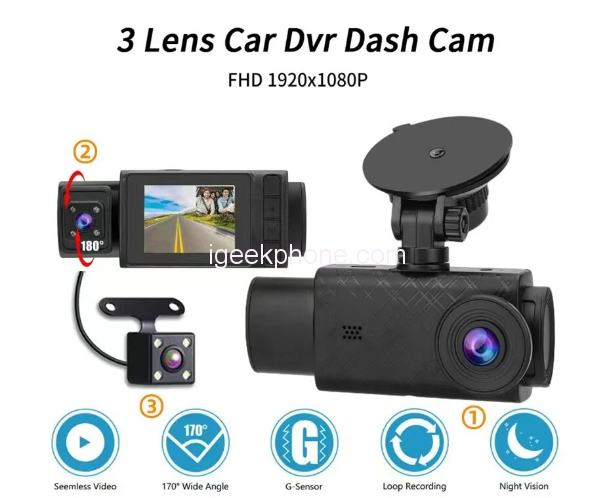 -Front and Rear Recording: Equipped with three lenses, the recorder captures video simultaneously from the front and rear of the vehicle, providing comprehensive coverage of both directions.