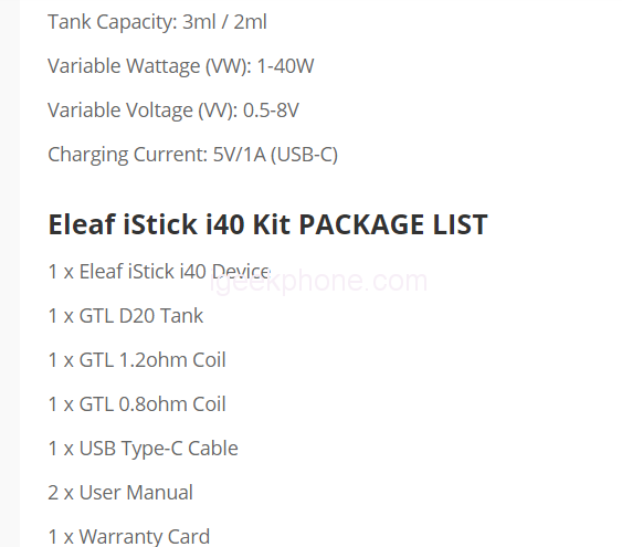 - Eleaf iStick i40 Vape Kit With GTL D20 Tank