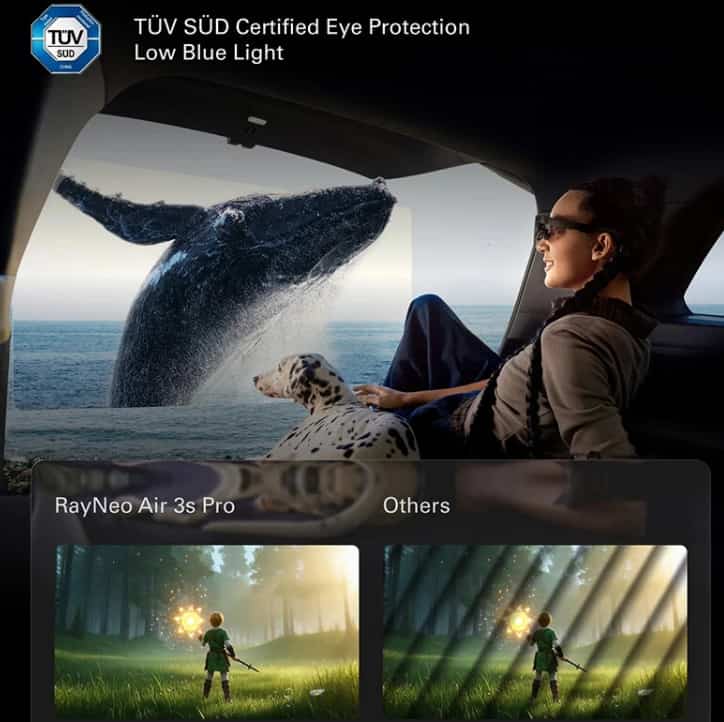 The Air 3s Pro carries TÜV-certified Low Blue Light & Flicker-Free assurance and uses high-frequency PWM dimming (3,840 Hz) to reduce eye strain during marathon viewing or gaming sessions.