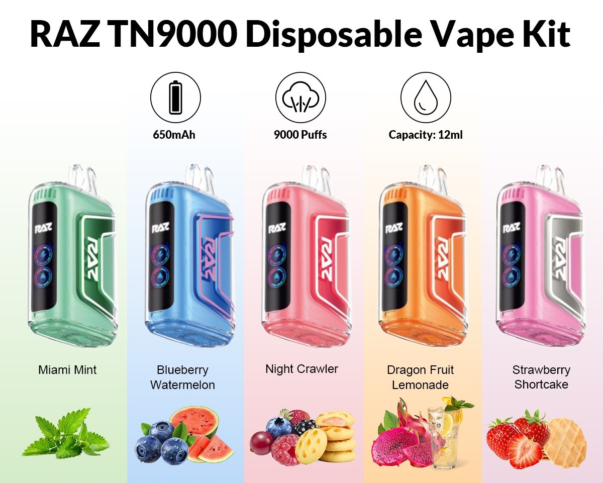 In the world of vaping, the RAZ TN9000 Disposable Vape Kit has emerged as a promising contender, boasting a powerful combination of 5% nicotine strength, a substantial 12ml pre-loaded vape juice, and a rechargeable 650mAh battery. With a promise of up to 9000 puffs and an adjustable airflow design, this disposable vape seeks to redefine the vaping experience. Moreover, its sleek 0.96″ display screen ensures a user-friendly interface for monitoring both battery and e-liquid levels. Let’s delve deeper into the design, features, and overall performance of this cutting-edge device.