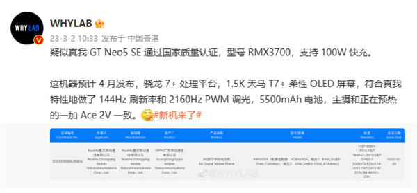 Today, a mobile phone model RMX3700 has officially passed the national quality certification and supports 100W fast charge, which is suspected to be Realme GT Neo5 SE in the pipeline.