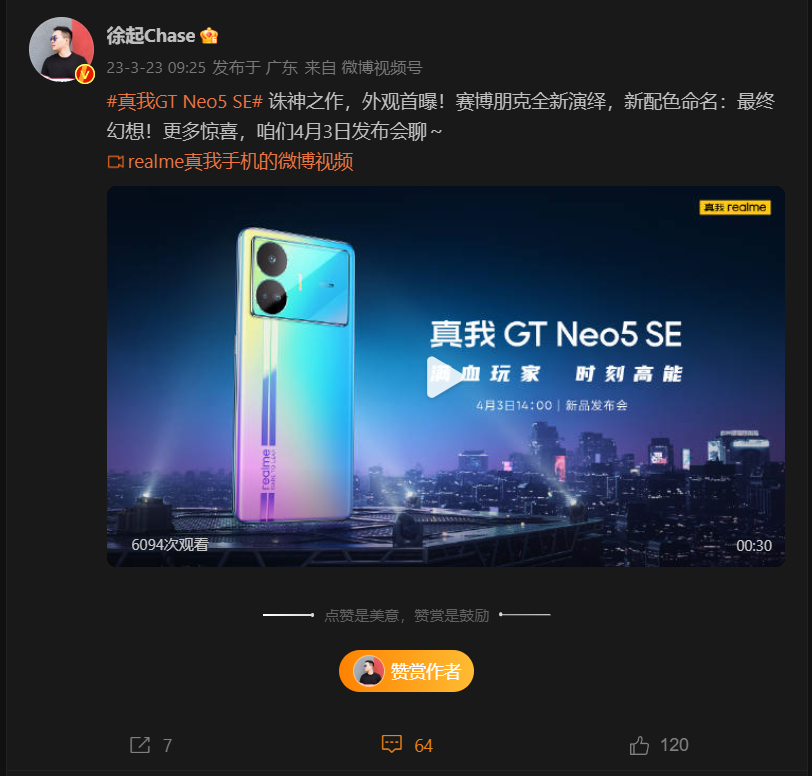 Realme today announced that Realme GT Neo5 SE will officially launch at 14:00 on April 3rd with the slogan “Full of Players, Always Energetic”, claiming that it has full-on leap-over performance and new black technology that will revolutionize the experience. At the same time, officials also revealed the Final Fantasy look of the new Cyberpunk color scheme.