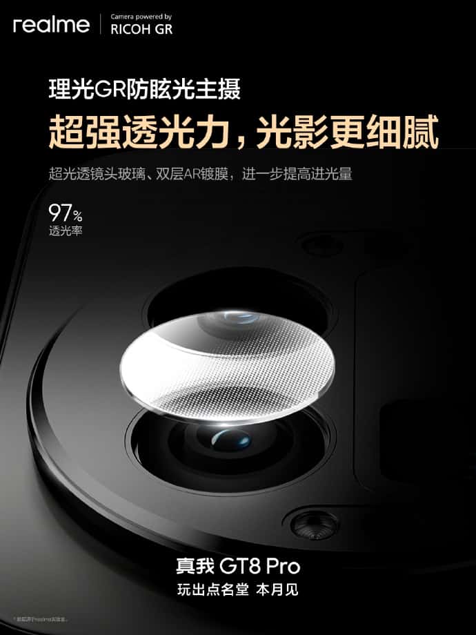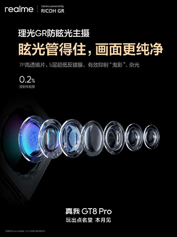 Today, Realme announced that the Realme GT8 Pro will be equipped with a Ricoh GR anti-glare main camera. This is the first main camera lens in the industry to pass the Ricoh GR optical standard certification, and it has passed the professional camera-level standard tests of anti-glare, low distortion, high resolution and low chromatic aberration.