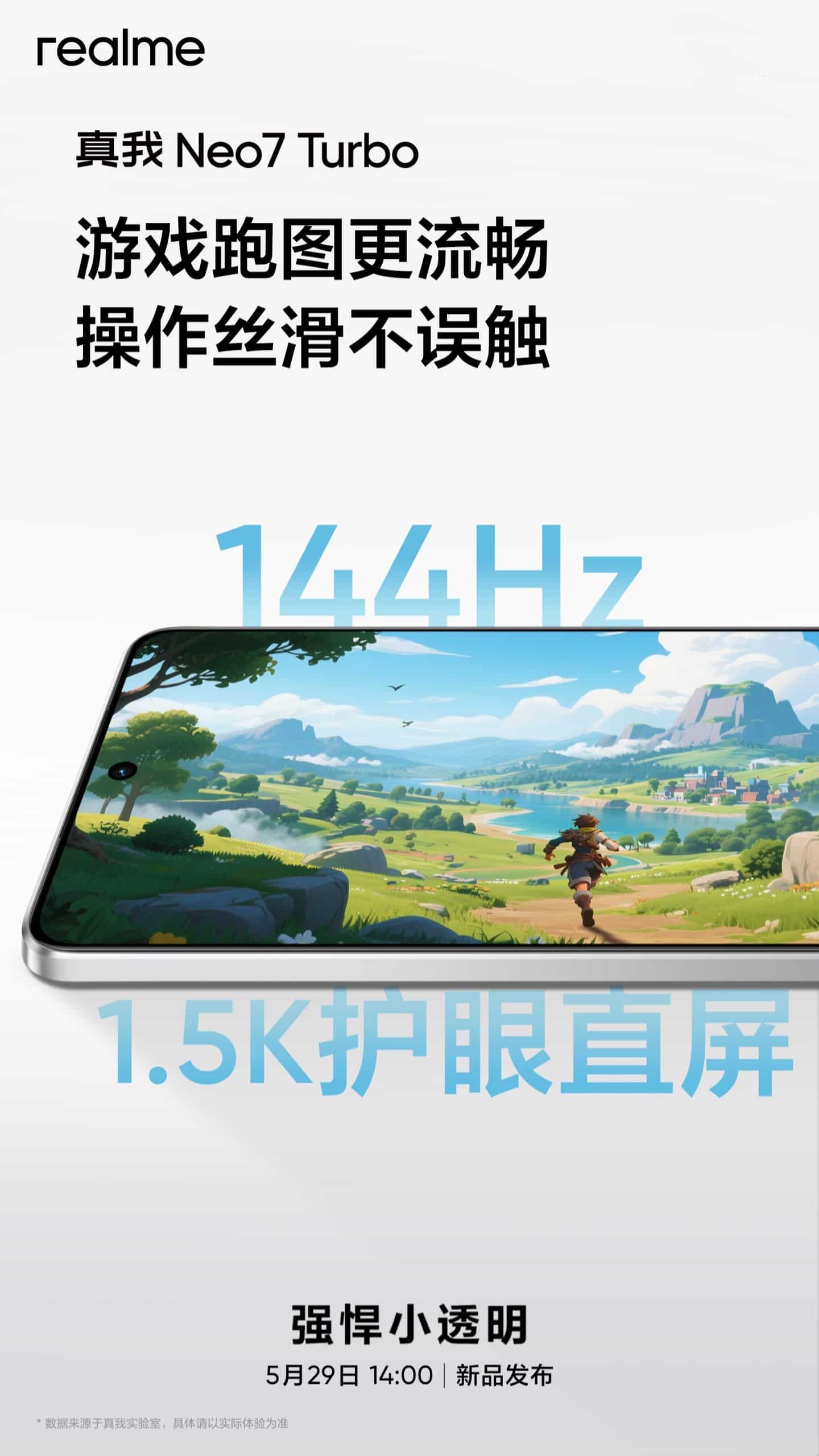 Igeekphone News, May 26th: Realme Neo7 Turbo phone will be released at 14:00 on May 29th. Realme officially confirmed that this new phone will be equipped with a 1.5K 144Hz eye-protecting straight screen, claiming that “game graphics run more smoothly”.