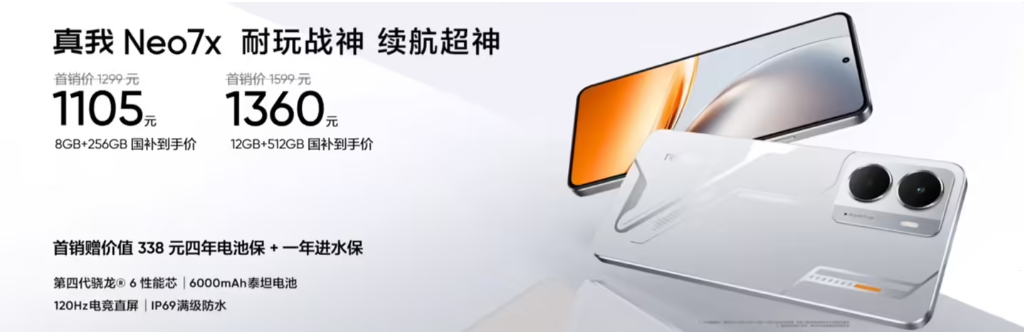 Igeekphone February 25 news, realme Neo7x mobile phone officially released today, its support for IP66/68/69 waterproof rating, can be anti-spray, anti-bubble, anti-cold, anti-heat, known as full waterproof. Its built-in 6000mAh battery is equipped with “bypass charging” technology to support charging while playing.