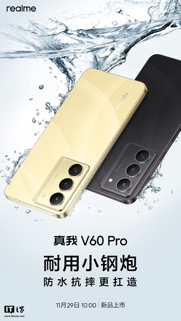 RealMe V60 Pro mobile phone will be launched at 10:00 on November 29, the new machine has obsidian gold/rock black two colors, using a vertical edge design, known as “durable small steel gun”.