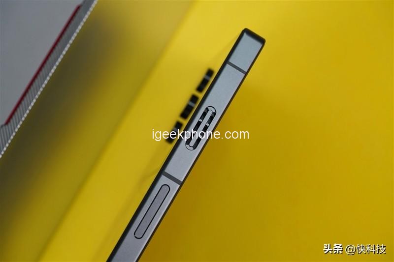 The volume button of the mobile phone is located on the left side of the fuselage, and it also has a cooling vent. On the right side of the phone, there are fan cooling vents, a power button, and red e-sports button.