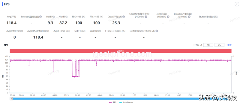 The Peace Elite mobile game runs with smooth image quality in 90-frame mode. After nearly 20 minutes of game testing, there was only a small frame drop during the period, but the continuity of the screen is still good, with an average frame rate of 90.4 FPS, the variance of the frame rate is 1, and the overall fluctuation is not large.
