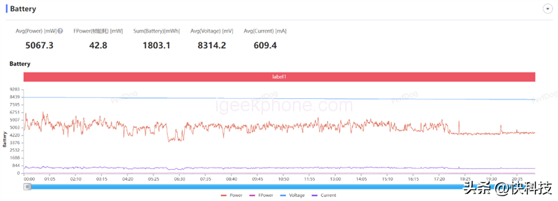 In terms of power consumption, the average power consumption of a 20-minute game is about 5.0673W, which is quite satisfactory overall.