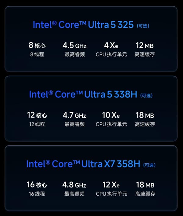 In terms of performance, it is equipped with the third-generation Intel Core Ultra processor, using 18A manufacturing process. It offers three configurations for selection: Ultra 5 325, Ultra 5 338H, and Ultra X7 358H. The multi-core computing power and graphics performance have been significantly enhanced. The built-in NPU can achieve a maximum AI computing power of 180TOPS, supporting local AI acceleration and running of edge-side large models.