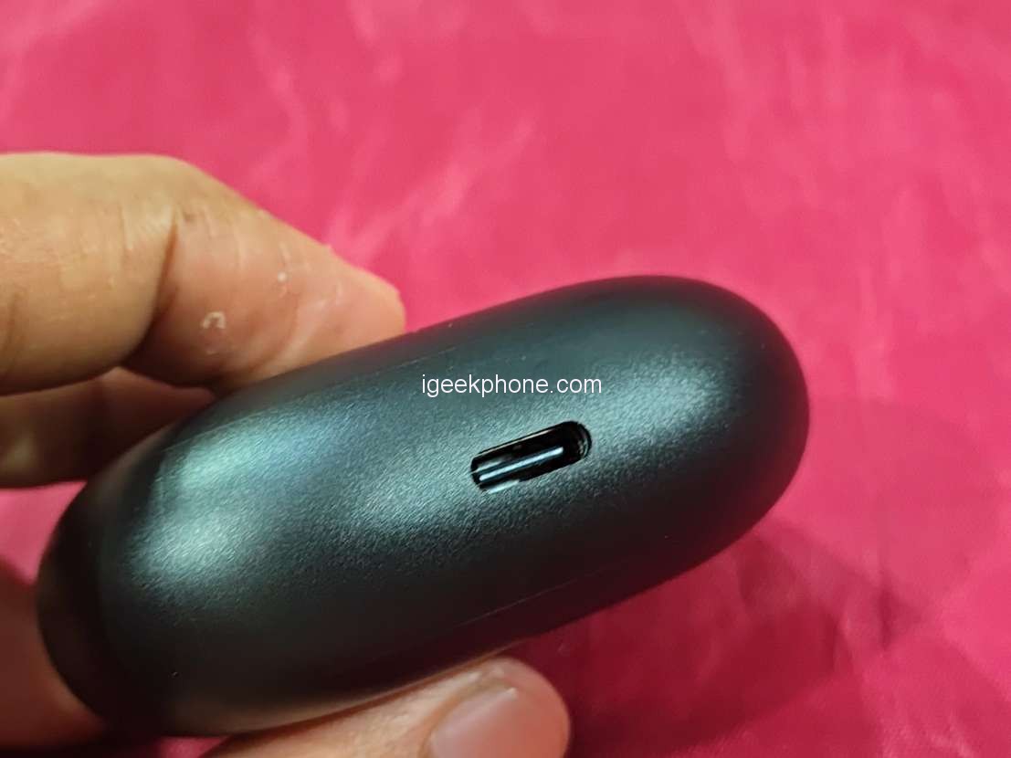 The charging case is quite modest (60 × 46 × 23.7 mm), so it can easily fit into any pocket of jeans, even tight ones. Unfortunately, the material used is very susceptible to scratches, and in terms of design, it is not shocking – it is ordinary with the engraved Redmi logo on the back near the USB Type-C port.