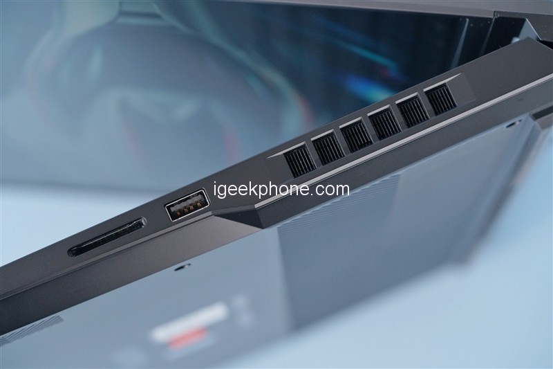In terms of interfaces, the left side of the laptop is a USB-A 2.0 and 3.5mm combo jack, and the right side is a USB-A 3.2 Gen2 and SD high-speed card reader. Half of the D side is open for heat dissipation, and the two sides of the bottom are the speaker placement positions.