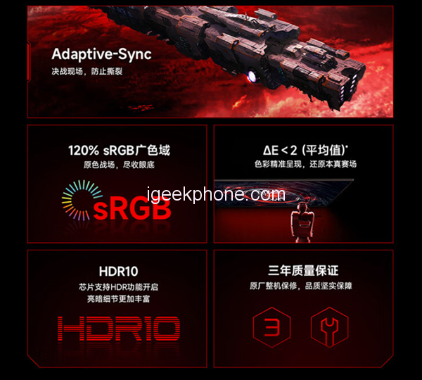 It also supports MPRT technology, achieves a super-fast response speed of 1ms, is compatible with G-Sync and Free-Sync functions, keeps the transmission frame rate of the graphics card and the display synchronized, and prevents fast dynamic picture tearing and freezing.