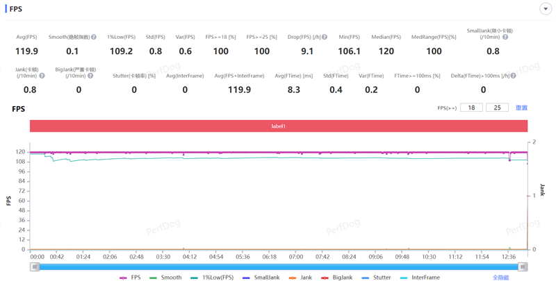 This lighter MOBA title was run at 120 FPS with ultra graphics during a 5v5 battle scenario. The K Pad maintained an average of 119.9 FPS with negligible fluctuation (0.1 FPS), consuming just 4.29W on average. The energy efficiency was outstanding at 27.95 FPS/W. Post-game, the back of the device peaked at just 34.1°C.