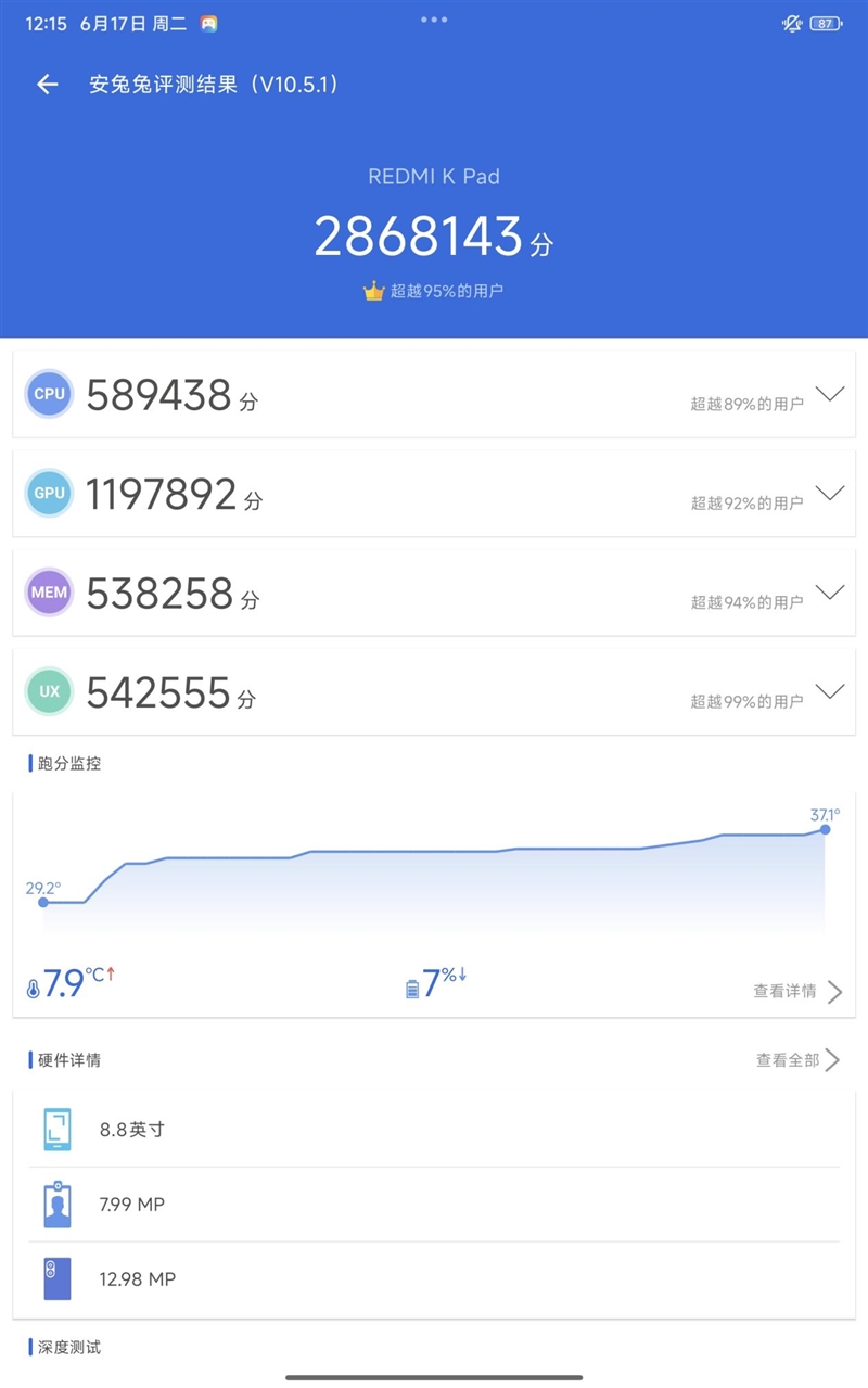 In synthetic testing, the K Pad achieved an impressive total score of 2.868 million. This includes a CPU score of 589,400 and a GPU score of 1.1979 million — putting it among the top-performing Android tablets available today.