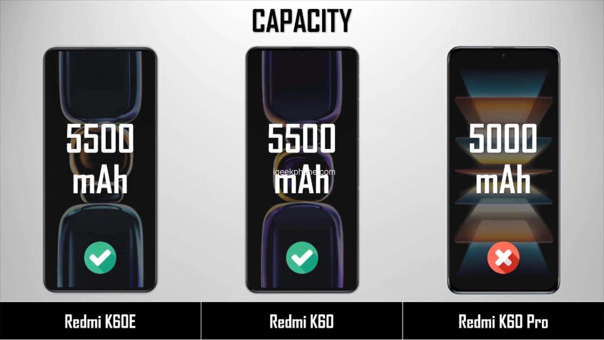 The Redmi K60 Pro boasts a 5000 mAh battery that supports 120W wired fast charging and 30W wireless fast charging. Meanwhile, the Redmi K60 has a 5500 mAh battery with 67W wired and 30W wireless fast charging capabilities. The Redmi K60E is powered by a 5500mAh battery and supports 67W wired fast charging.