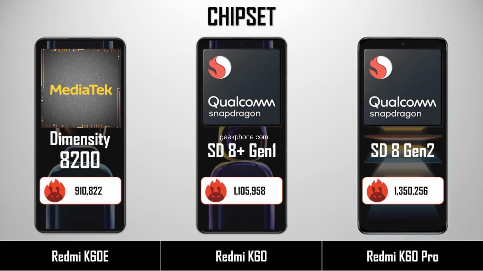 There are three different designs for the hardware configuration of the Redmi K60Pro, Redmi K60, and Redmi K60E. The Redmi K60Pro, as the top model, boasts a second-generation Snapdragon 8 processor. The Redmi K60 is equipped with a Snapdragon 8+ processor, while the Redmi K60E has a Dimensity 8200 processor.