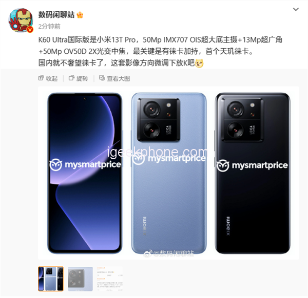 The Mi 13T Pro is set to feature a primary camera using a 50-megapixel IMX707 sensor, accompanied by a 13-megapixel ultra-wide-angle lens and a 50-megapixel 2x optical zoom lens.